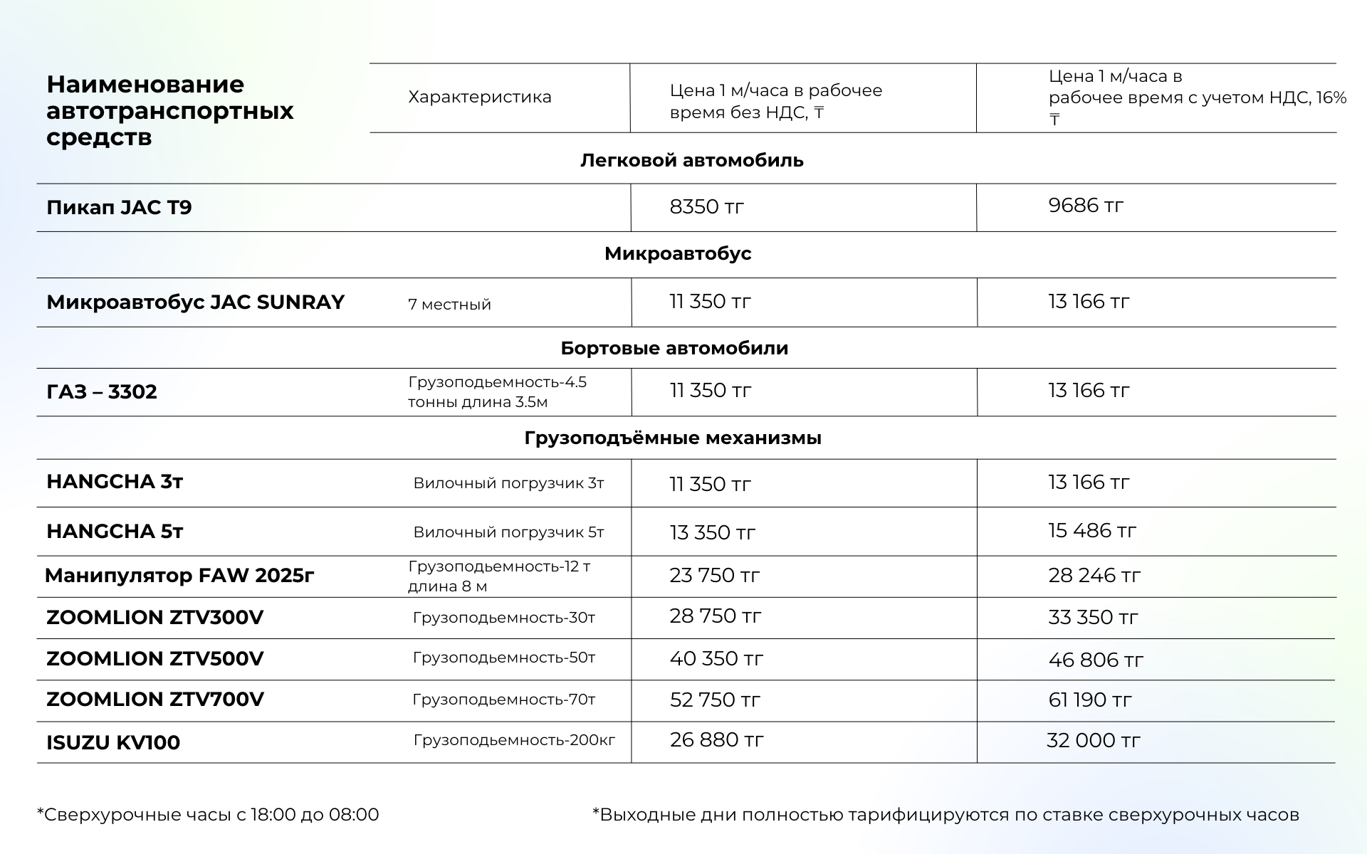 Стоимость аренды включает работу техники с опытным оператором и топливо. Дополнительные услуги обсуждаются индивидуально.